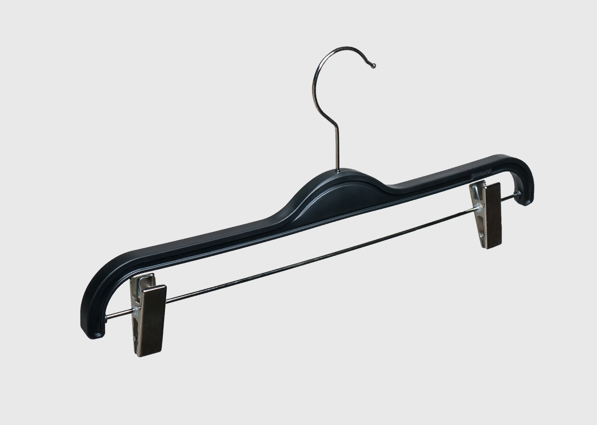 Вешалка для брюк и юбок с металлической перекладиной и прищепками.