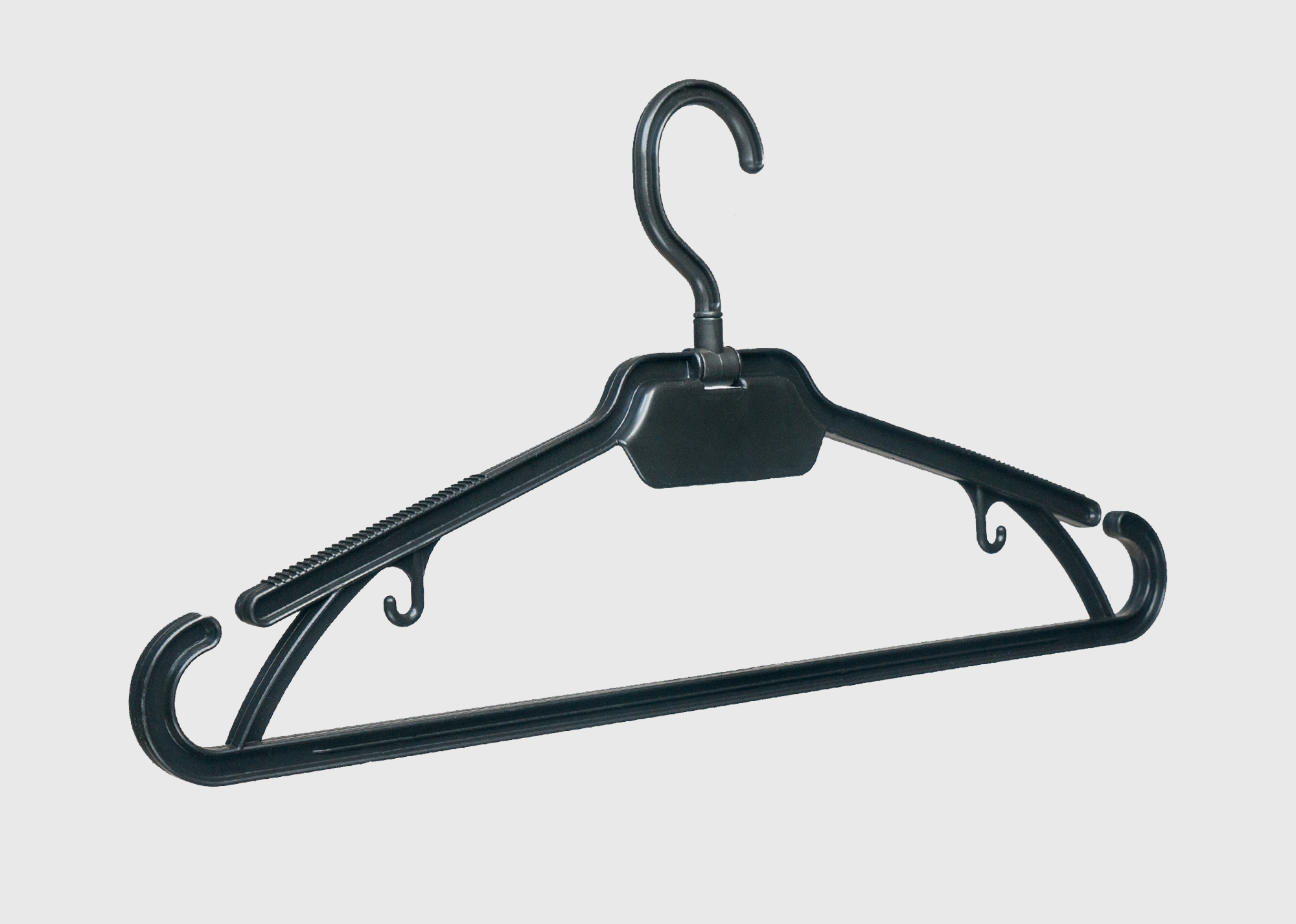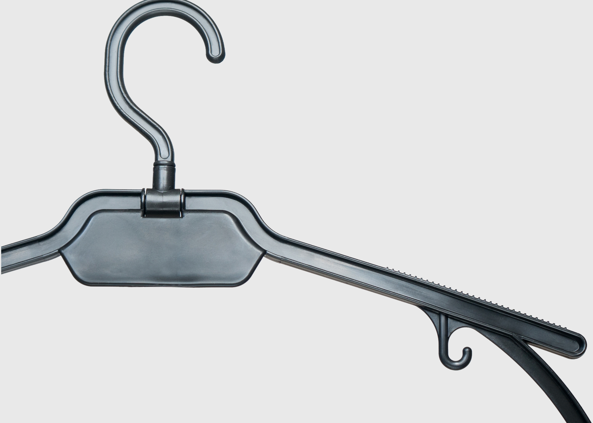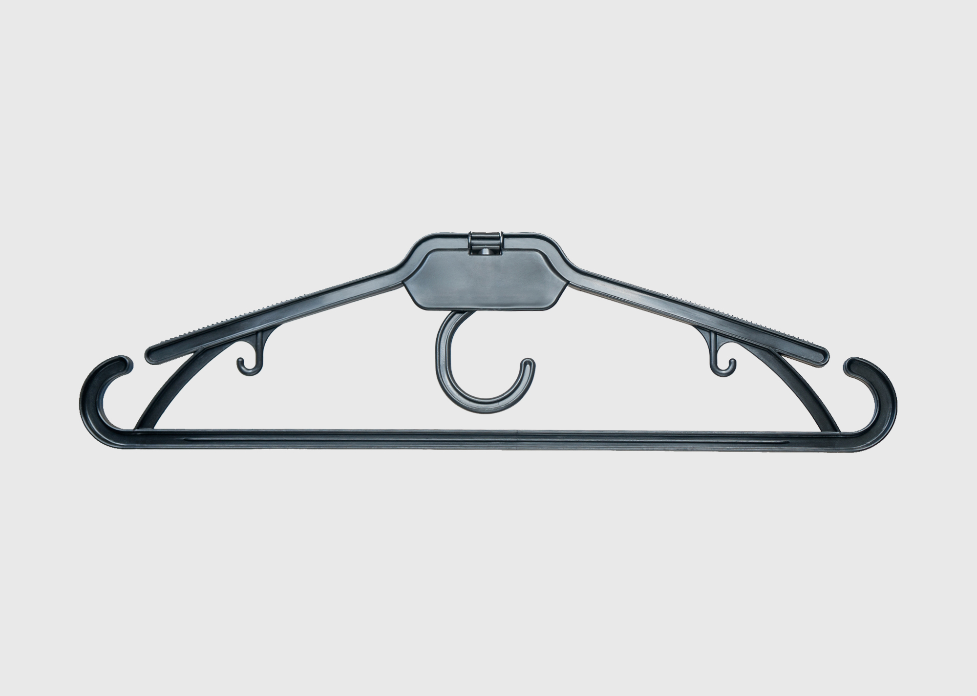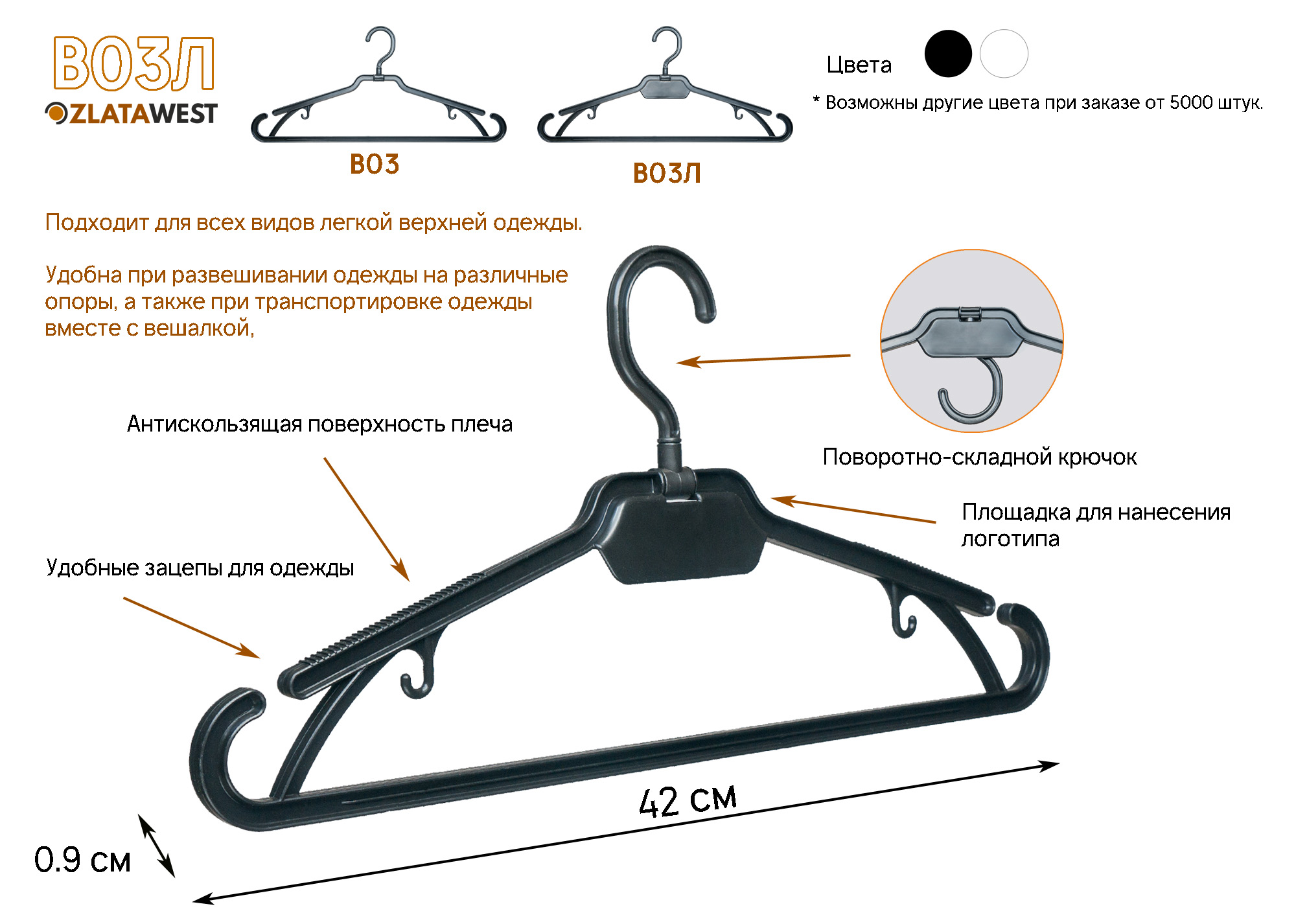 Модель вешалки со складным поворотным крючком доступна в двух вариантах – с площадкой для нанесения логотипа (В003Л), и без площадки (В003). Складной поворотный крючок позволяет вывешивать изделие на различные опоры, а также транспортировать одежду вместе с вешалкой. Кроме этого, в вешалке имеются удобные зацепы для одежды, а также антискользящая поверхность плеча.