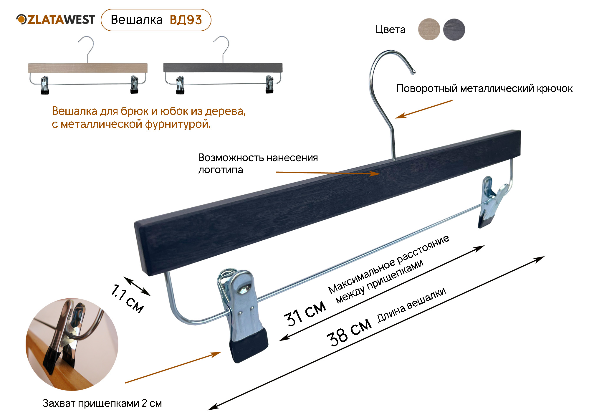 • Длина: 38 см • Цвет: натуральный (дерево), серый • Перекладина с прищепками, возможны 2 цвета – серебро и золото • Поворотный металлический крючок разных типов • Нанесение логотипа